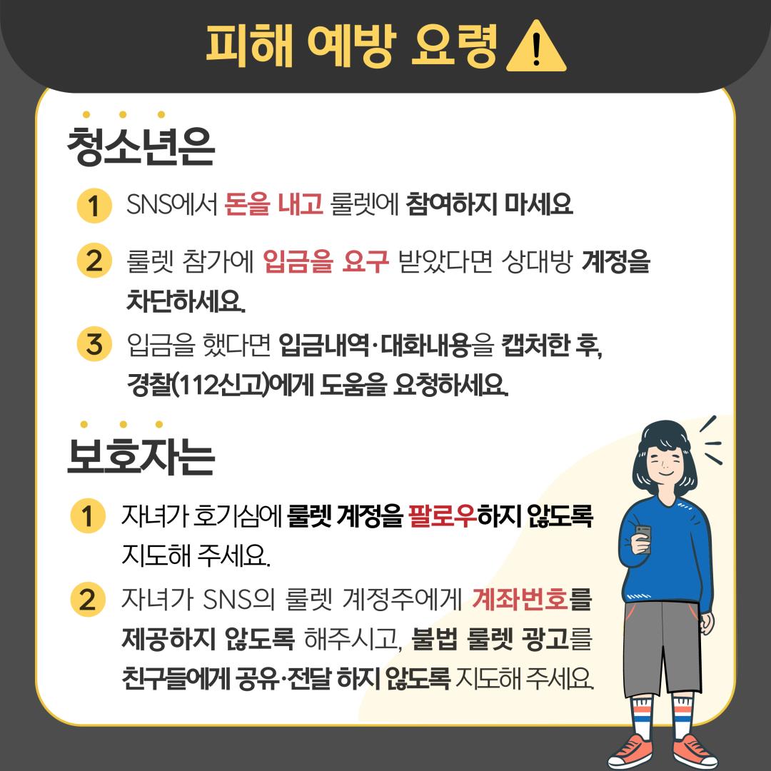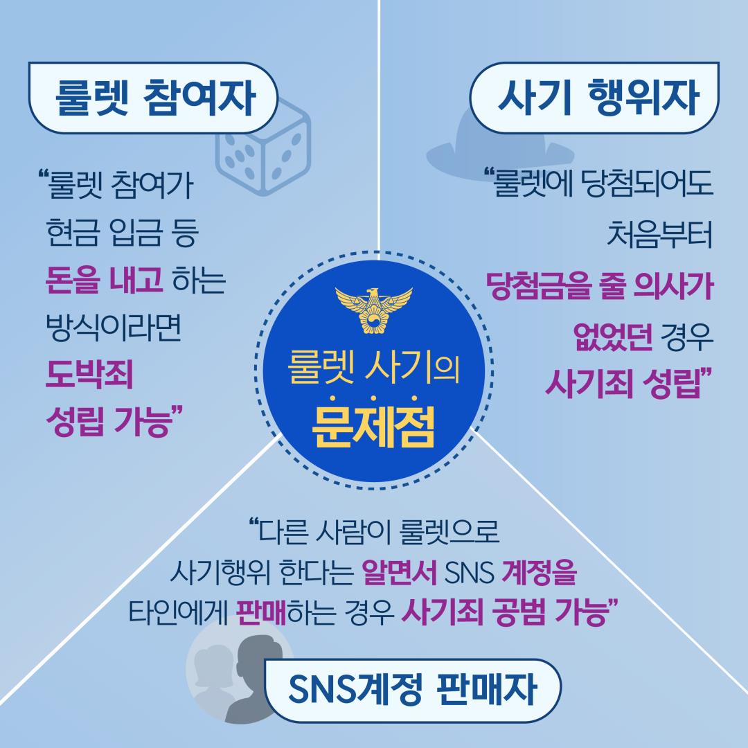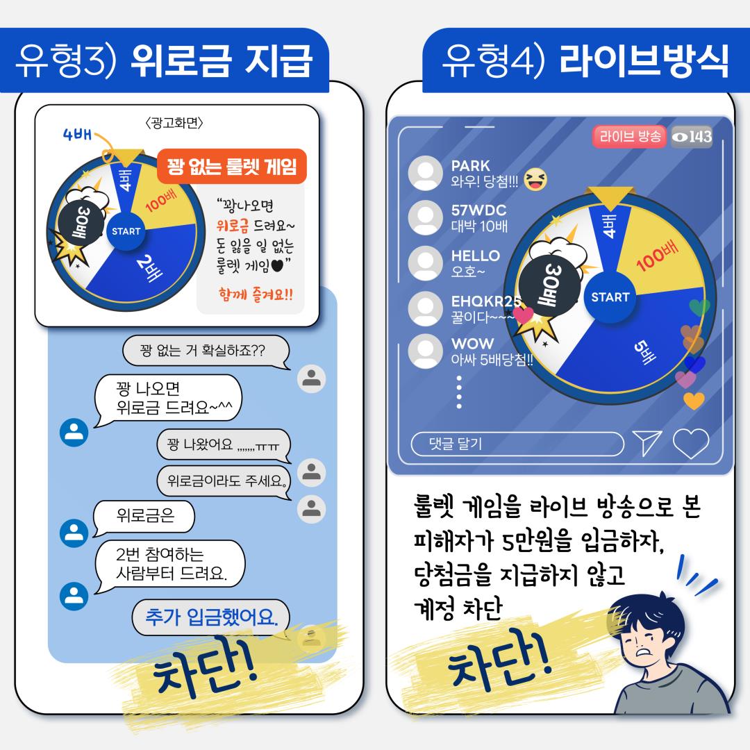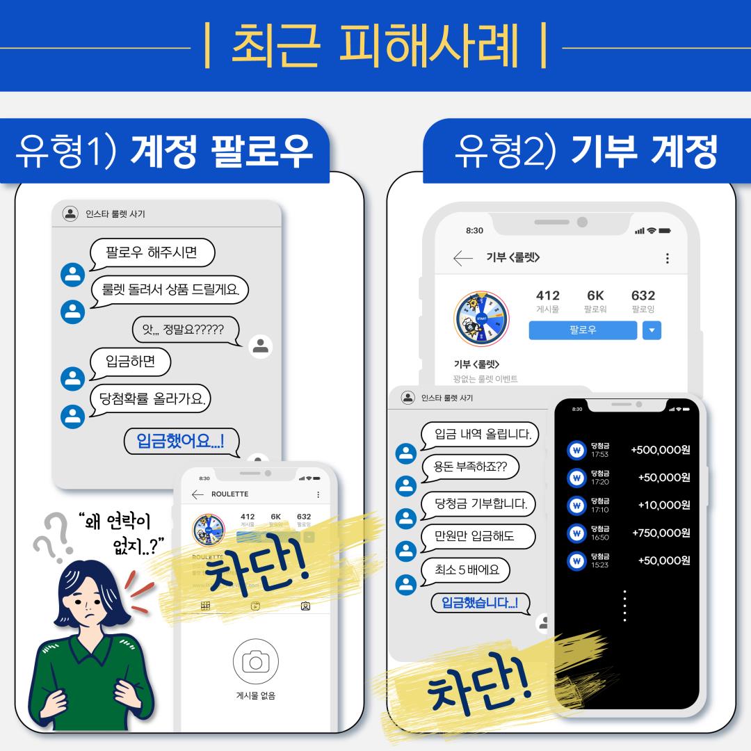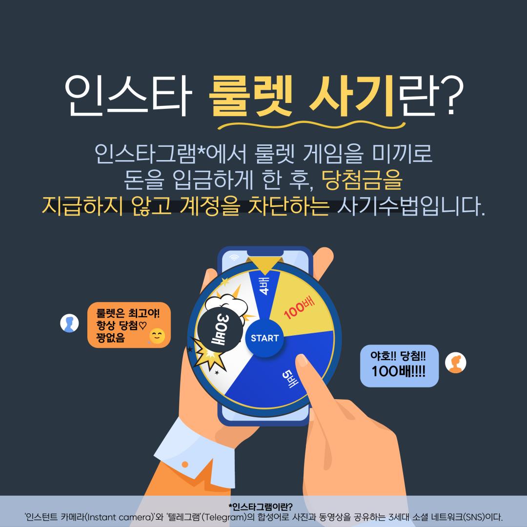 최근 청소년을 대상으로 사회관계방 서비스(SNS)상‘룰렛 사기 피해’발생사례가 증가하고 있어 경찰청에서 「신종유형 발생경보* 제10호(인스타 룰렛 사기)」를 발령하였습니다.